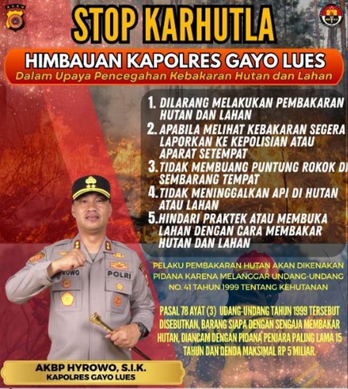 Kapolres Gayo Lues juga merinci enam poin penting yang harus dipatuhi oleh masyarakat demi mencegah terjadinya kebakaran hutan dan lahan:
