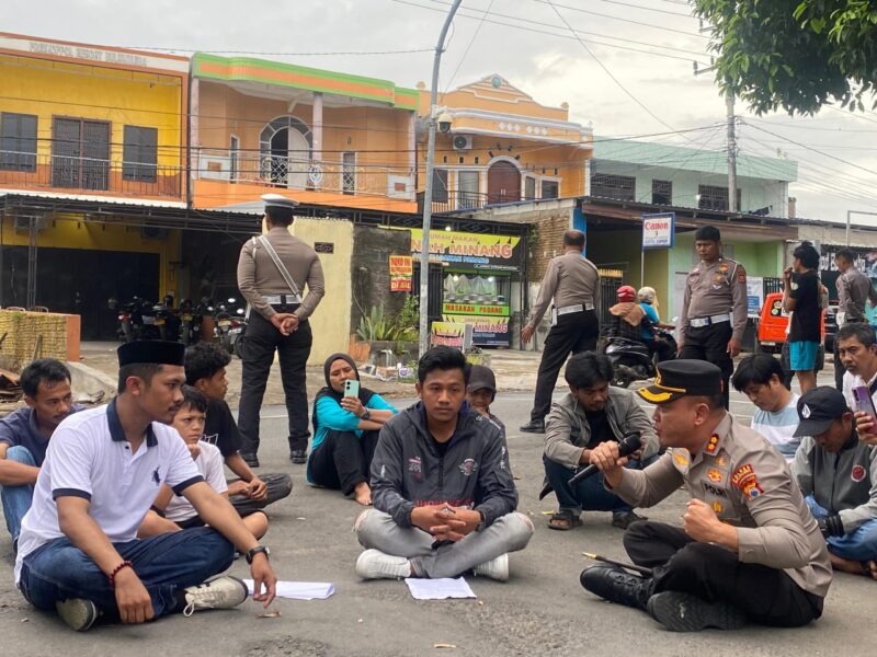 Dengan pendekatan humanis, Kapolres memilih duduk bersama di atas aspal untuk mendengarkan dan menerima langsung aspirasi para peserta aksi. Suasana dialog berlangsung terbuka dengan semangat *”duduk sama rendah, berdiri sama tinggi”* kata pribahasa.